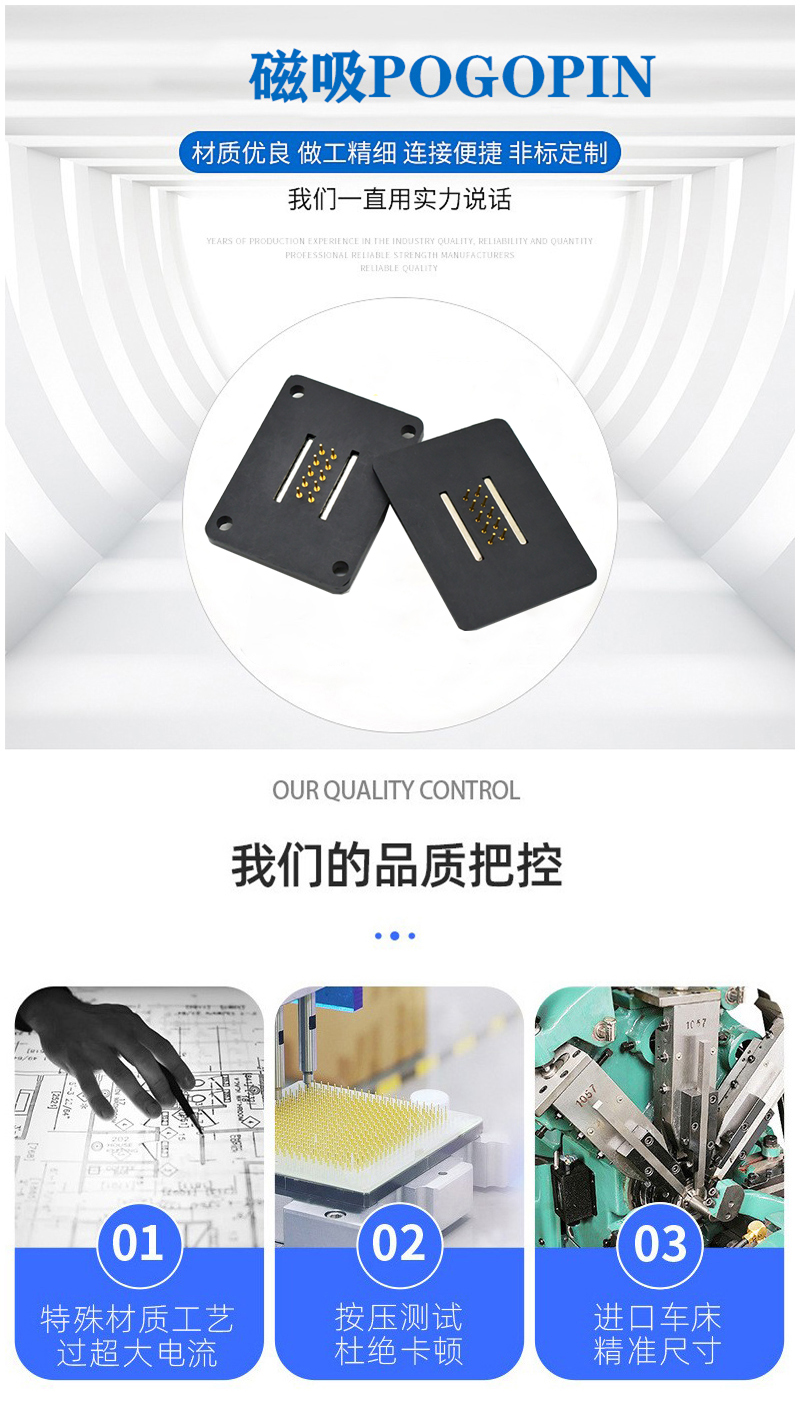 永探工廠生產(chǎn)的磁吸Pogopin是一種結(jié)合磁性吸附與彈簧頂針(Pogopin)技術(shù)的精密連接器,主要用于電子設(shè)備的充電、信號傳輸及數(shù)據(jù)連接。其核心在于通過磁鐵實現(xiàn)快速自動對接,同時利用彈簧頂針確保穩(wěn)定的電接觸。
